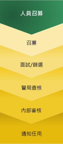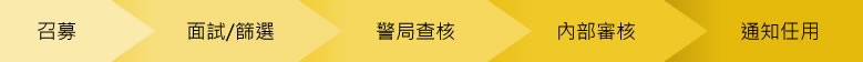 由本公司人事部向就業服務站與人力銀行發布職缺之訊息,求職者得知訊息後,於本公司上班時間至公司填寫基本資料與警察局前科查核表後,由公司人事經理進行面談,再經由內部主管討論會談後,結果將於查核完畢後甫通知任用。